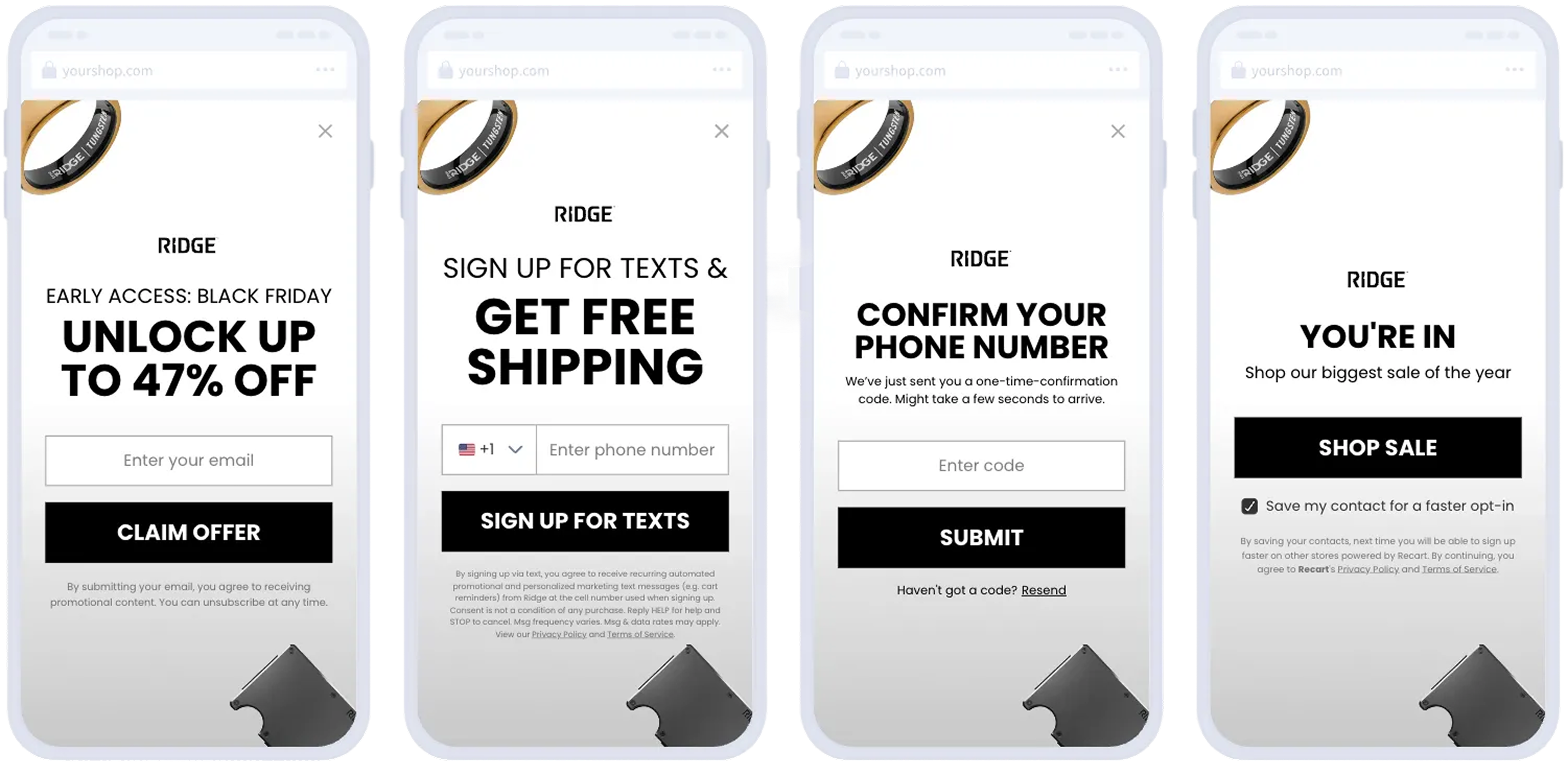 These CTAs should all drive to a landing page highlighting the benefits of SMS messages such as early access, sneak peeks, or updates on low stock.