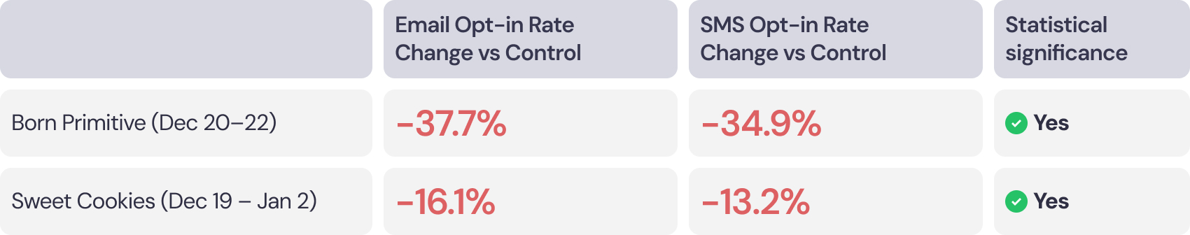 Novelty in design doesn’t always equal higher performance. For both Born Primitive and Sweet Cookies, sticking with the standard popup layout proved to be the better choice for driving both email and SMS opt-ins.