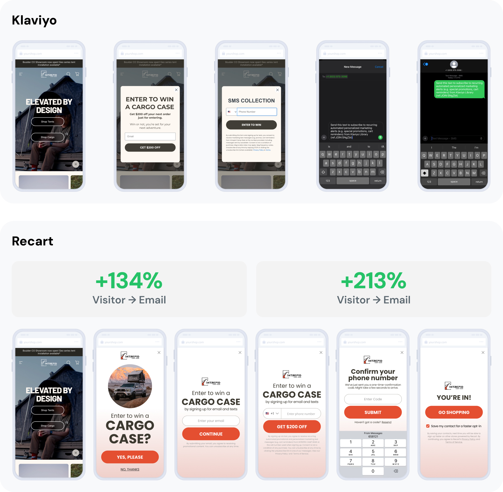 For Intrepid Camp Gear, this test shows that popup design and flow can be as important as traffic volume when growing both email and SMS lists. Even in a short time frame, the results were decisive: Recart’s approach outperformed Klaviyo’s by a wide margin.