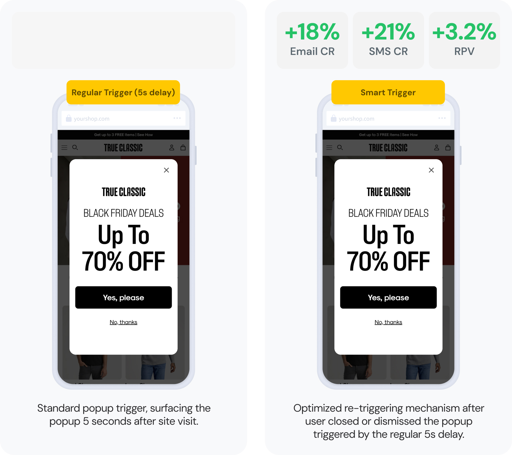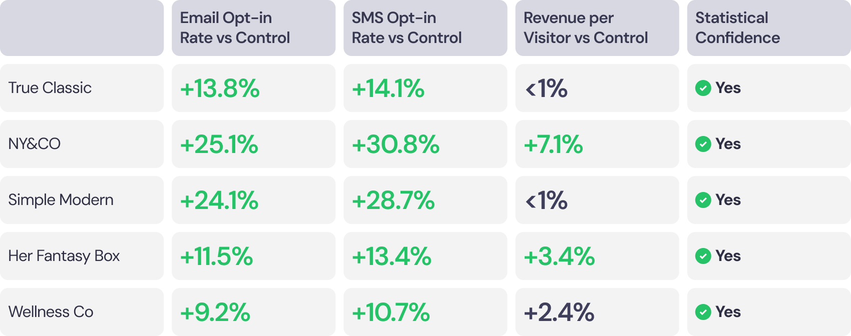 Across five Shopify brands, the Smart Trigger consistently improved performance — increasing email opt-ins by 10–31%, SMS opt-ins by up to 7.1%, and boosting revenue per visitor by 9–25%, all with statistically significant results.