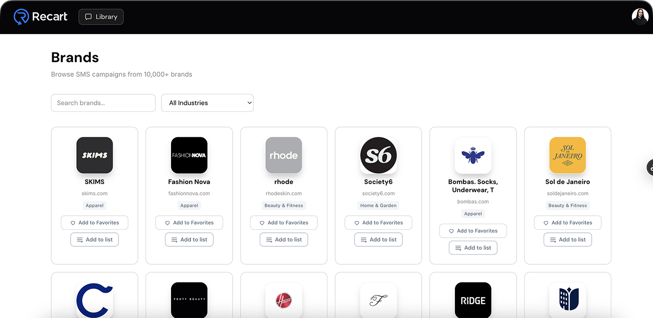 Browse 100,000+ real SMS campaigns from 10,000 stores. Search by brand, industry, or keyword — completely free.